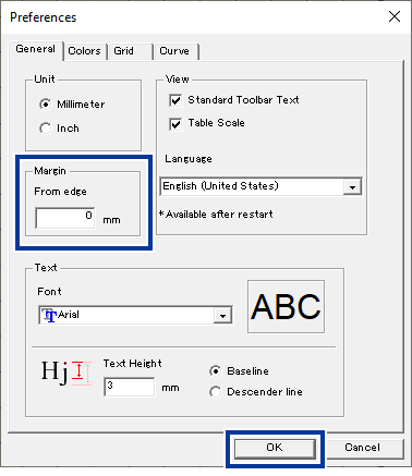 When you're imprinting on cylindrical material, set the margins to zero millimeters. Compared to flat material, when imprinting on cylindrical material, the imprint area is limited, and so a sufficient imprint area must be ensured by making the margins zero millimeters in size.