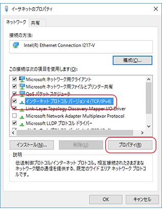 インターネット プロトコル バージョン4(TCP/IPv4)を選択し、プロパティをクリックする。