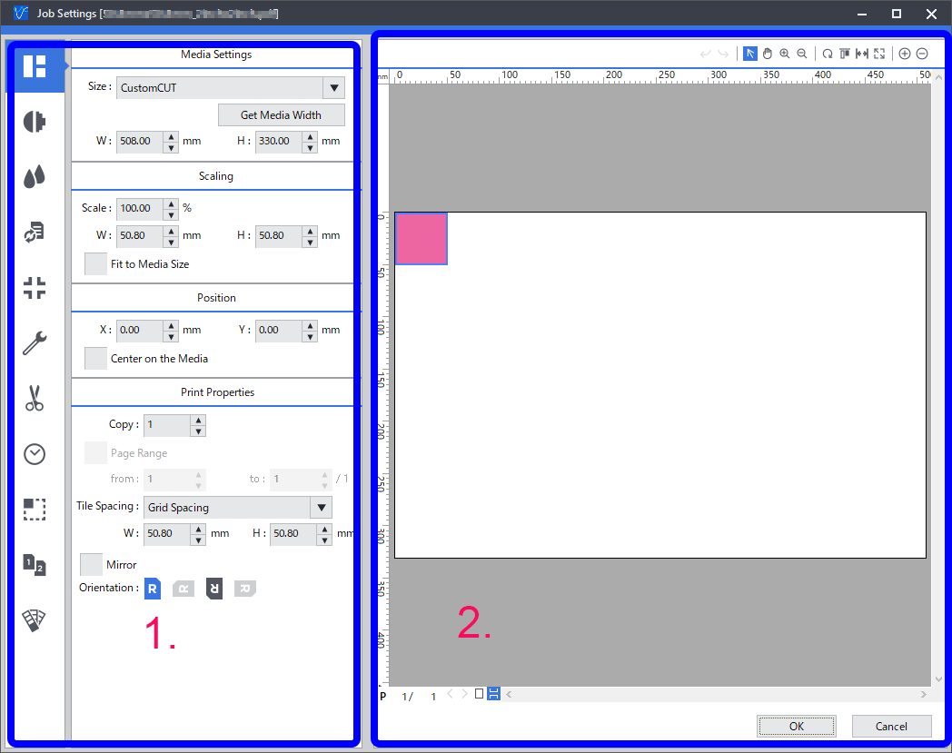 - Dies ist der Layoutbereich, in dem Sie die Druckposition des Jobs im Fenster überprüfen können. Mit den Bearbeitungswerkzeugen am oberen Rand des Layoutbereichs können Sie die Druckposition beim Überprüfen des Fensters festlegen.