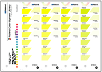 - Die Farben in der Bibliothek sind nach Sättigung kategorisiert und so angeordnet, dass sie sich in horizontaler Richtung dem Farbton nach und in vertikaler Richtung der Helligkeit nach unterscheiden. Sie benötigen ein Medium der Größe A1 oder größer, um diese Farbtabelle in ihrer Originalgröße zu drucken.