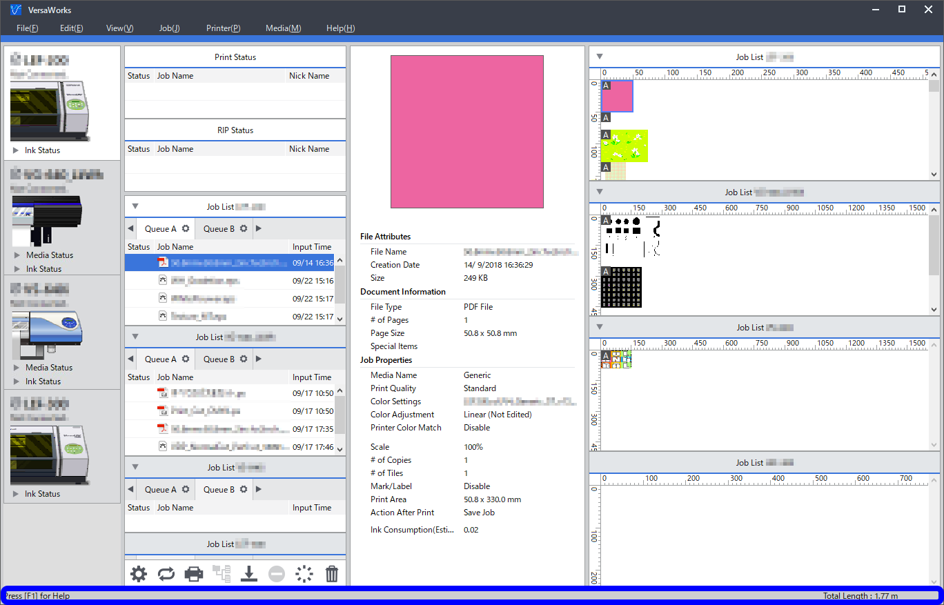 Der aktuelle Status von VersaWorks (die Erklärung der gewählten Funktion, der freie Speicherplatz auf dem Laufwerk und die gesamte Drucklänge) wird angezeigt.