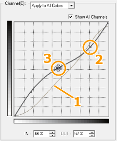 1. Tonkurve nach Stufenanpassung, 2. Steuerungspunkt, 3. Ziehen eines Steuerungspunktes