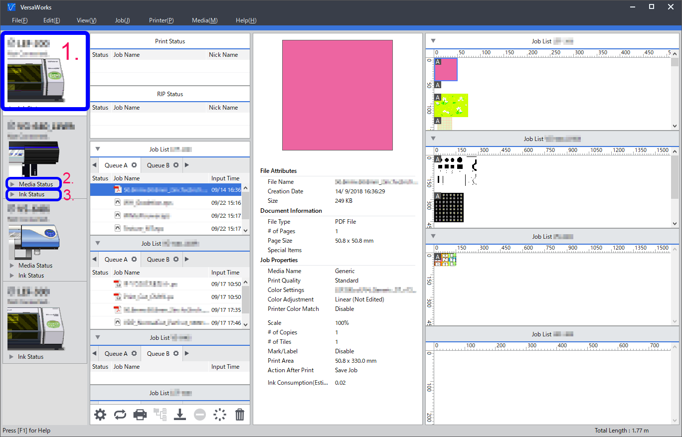 Hier werden ein Bild sowie der Status des mit VersaWorks verbundenen Druckers angezeigt. Doppelklicken Sie auf das Bild, um das Fenster Druckerstatus anzuzeigen. Informationen wie etwa die Firmware-Version und die Menge an verbleibender Tinte werden im Fenster Druckerstatus angezeigt.