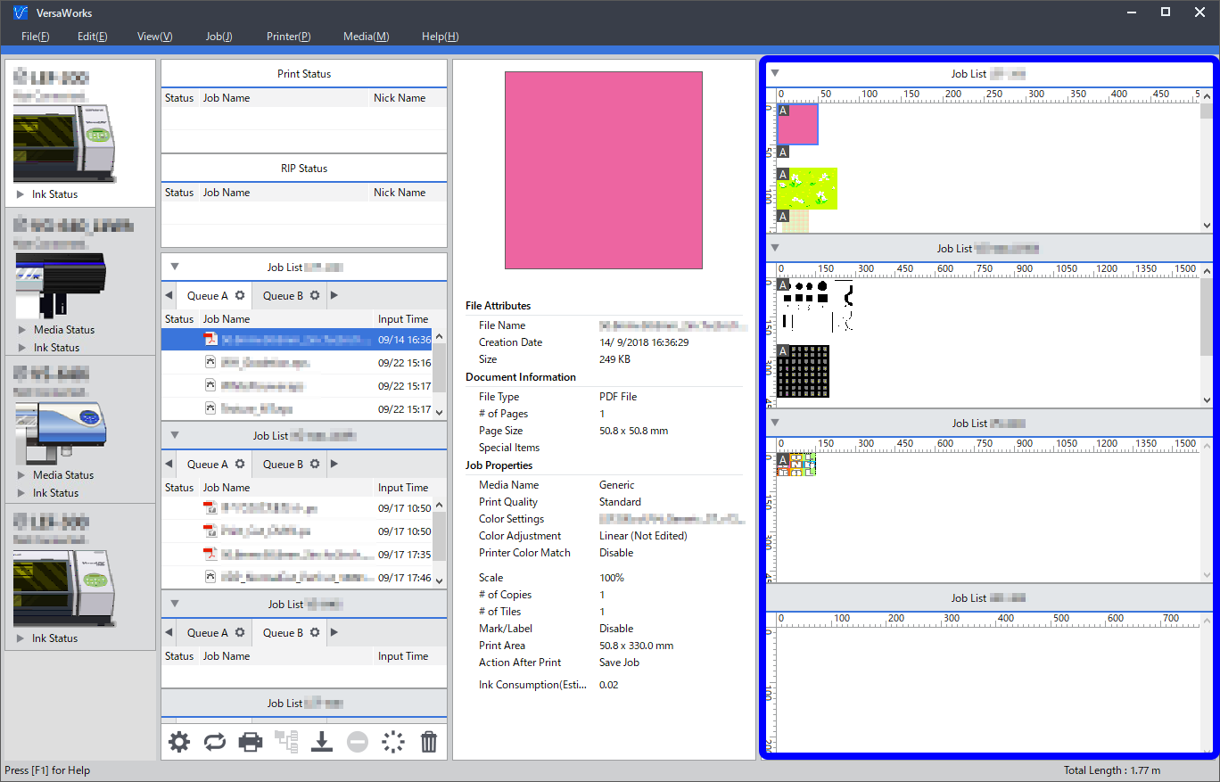 Lineale werden oben und links im Layoutfenster angezeigt. Dadurch ist es möglich, die Größe der Medien und Jobs zu überprüfen. Zum Festlegen der Einheit der Lineale verwenden Sie Einheit im Fenster Voreinstellungen. Aktivieren Sie das Kontrollkästchen Warteschl.-Symbol in Layout-F. anz. im Fenster Voreinstellungen, um die Daten im Warteschlangenordner zu identifizieren, aus dem die Jobs kommen.