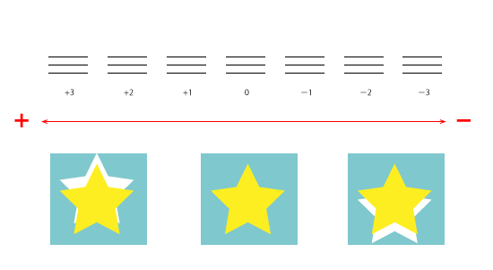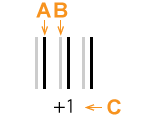 - Geben Sie die Korrekturwerte Horizontale und Vertikale ein. Wählen Sie auf dem gedruckten Testmuster die Werte aus, die eine möglichst geringe Fehlausrichtung zwischen A (der schwarzen Linie) und B (der Spotfarblinie) ermöglichen. Geben Sie die C-Werte ein (sie stehen für die Korrekturwerte Horizontale und Vertikale), die auf dem Testmuster angegeben sind.