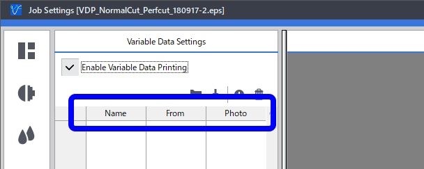 . - Selecione a caixa de verificação Activar impressão de dados variáveis.Uma pré-visualização do modelo é apresentada na área de esquema e aparece a janela Atribuir. Além disso, os nomes dos campos variáveis (nomes de cores diretas com o prefixo "VDP_" removido) especificados no Passo 1: Criar um modelo são apresentados na primeira linha da lista em Definições de dados variáveis.