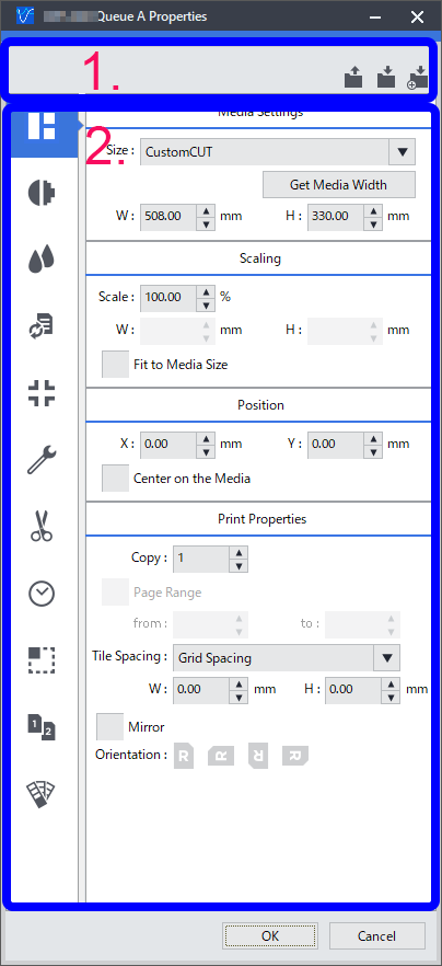 - É possível utilizar esta área para gravar os detalhes definidos na janela Propriedades da fila como um ficheiro de definições de impressão e para carregar ficheiros de definições de impressão gravados.