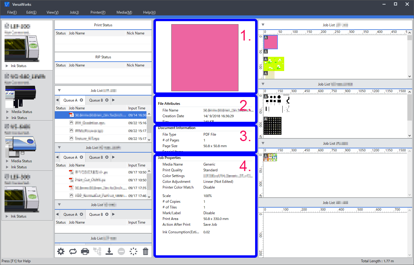 Esta área apresenta a pré-visualização, informações do ficheiro, informações sobre o documentos e informações de definições da tarefa selecionada na lista de tarefas.