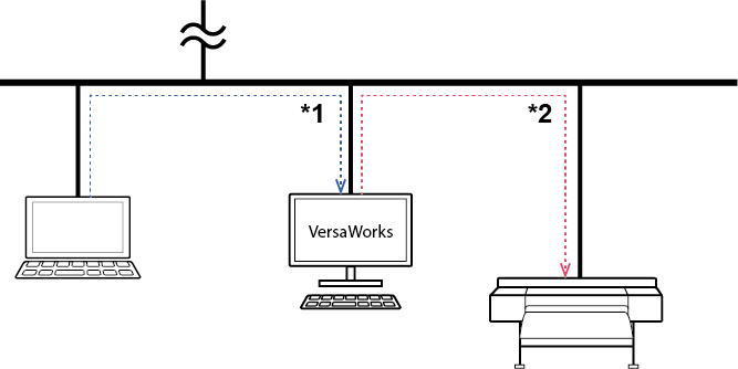 Transmita os dados criados num cliente para o servidor RIP (*1). Embora um ficheiro de imagem transmitido a partir de um cliente seja enviado para a impressora através do servidor RIP (*2), o servidor RIP trabalha como uma impressora quando visto a partir de um cliente.