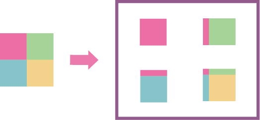 在拼接塊的左上方建立重疊寬度。此設定適用於先黏貼右下塊(黃色),再黏貼其餘 3 塊的情況。